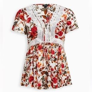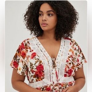 Torrid 6x Babydoll Crinkle Gauze Crochet Inset Lace-Up Top