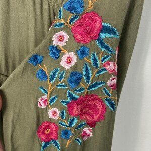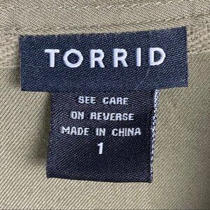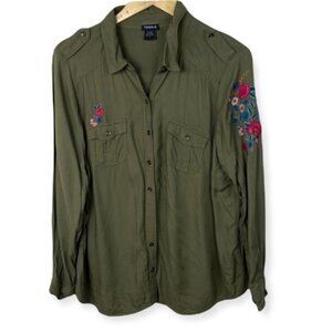 Torrid Army Green Twill Shirt Floral Embroidery Size 1X Bohemian Shirt Boho Top