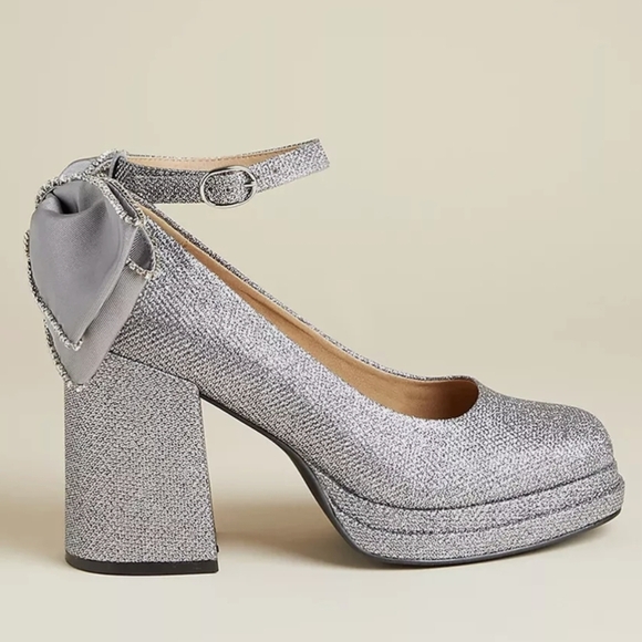 Step into elegance with these Torrid Betsey Johnson Bow Back heels, showcasing a shimmering silver finish and a retro-inspired platform design. The chunky block heel and ankle strap with buckle closure offer both style and stability, while the charming bow detail on the back adds a touch of sophistication. Perfect for any glamorous occasion, these heels effortlessly blend vintage allure with modern sparkle.