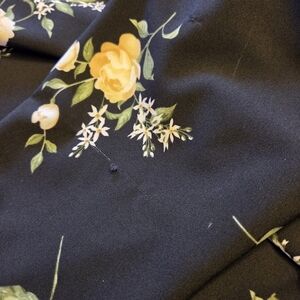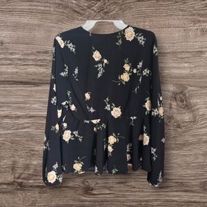 This stylish top showcases a black base with cream floral patterns, featuring a wrap design and a notched collar for a chic appearance. The blouse's flowy fabric and floral style make it perfect for both casual and formal settings.