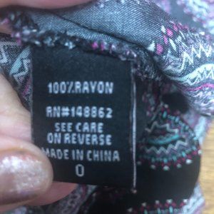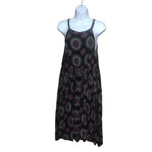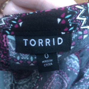 Torrid black medallion hi lo challis dress. Halter like top with one button closure. Large opening for arms. Full skirt that is high low. Size 0 (Size 12 by chart online). 100% Rayon Armpit to armpit measures approx. 19 inches Waist is elastic and measures approx. 17-20 inches Back length measures approx. 44 inches Pre Owned. Carefully steamed or washed and prepared for a new life. No stains or holes.