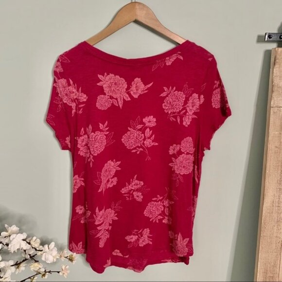 Burgundy tee with floral print. Short sleeves. V-neck design.