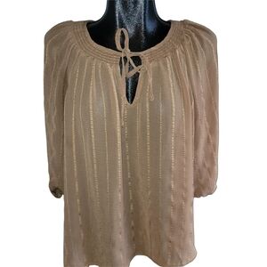 This elegant tan sheer women's top features a stylish design perfect for any occasion. Its soft fabric and chic look make it a must-have in your wardrobe. Has a rope tie neckline and 3/4 raglan style sleeves.