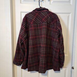 Stylish burgundy plaid jacket. Features button front and handy pockets. Perfect for layering.