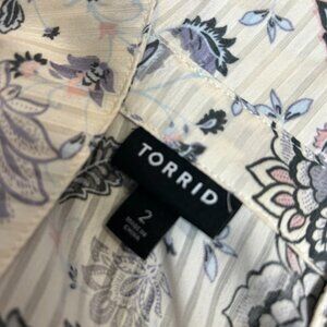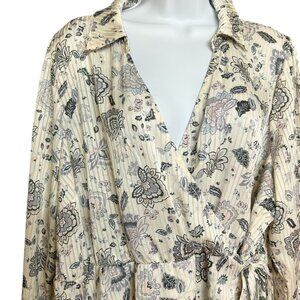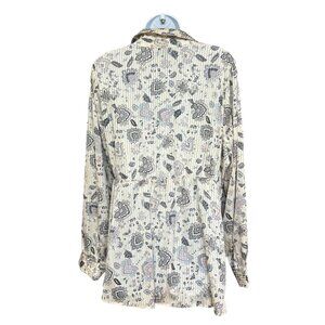Stylish cream blouse with black floral pattern. Features a flattering tie waist. Long sleeves and collared neckline.