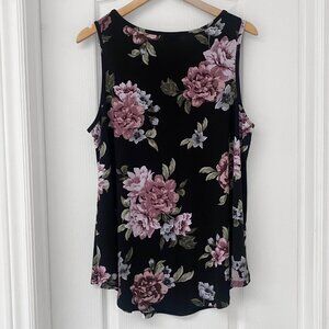 Featuring a floral pattern in shades of pink, mauve, and gray with green leaves