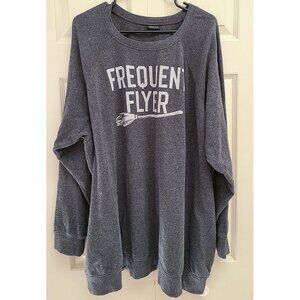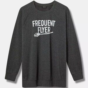 Perfect for fall is this charcoal grey classic raglan style sweatshirt with witchy, "Frequent Flyer" broom graphic print. Fitted up top, eased through the body, the essential cozy fleece knit fabric of this long sleeved sweatshirt is soft and comfortable. Torrid size 4 (fits up to size 26).