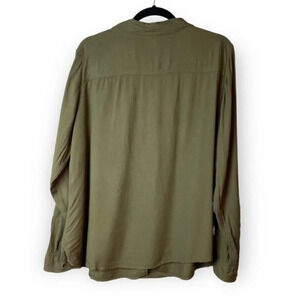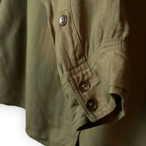This olive green twill shirt has masculine edge with army details like patch pockets paired alongside a button front and tab sleeves. The look is lightened up with gorgeous multi-color floral embroidery detailed onto the shoulders
