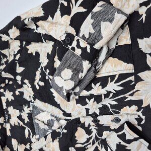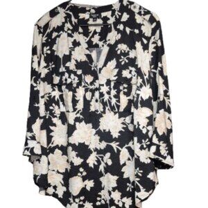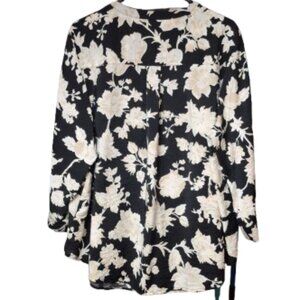 V neckline with1/2 button front. 3/4 button-up roll tab sleeves. Black with a cream floral print 84% rayon 16% nylon Machine wash Tumble dry