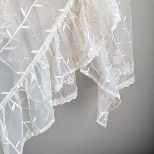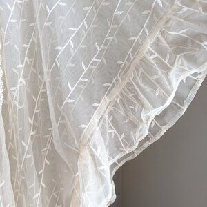 Sheer, flowy, easy for layering, elevates any outit! Beautiful mesh sheer fabric with ruffles for the trims and floral embroidery. Very lightweight and well made. 100% polyester. A closet staple!