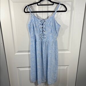 Chic light blue midi dress with lace-up front. Ideal for casual outings.