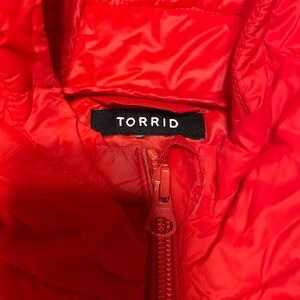 Lightweight puffer jacket in orange. I had this jacket in another colour and it was so light but still warm. Great for throwing in a bag because it doesn’t take up a lot of room. No size tag but fits like a 1 (14/16). Very slight discolouring at top of zipper (shown in pic) but may come out in wash. Great condition.