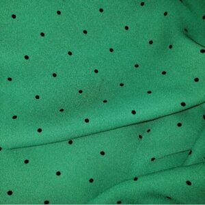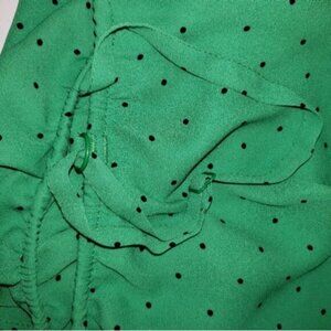 One shoulder ruffle top in green with black polka dots. Other shoulder has an adjustable spaghetti strap. The ruffle goes all the way around the neckline going under the left arm. Perfect for an upcoming Spring Fling!