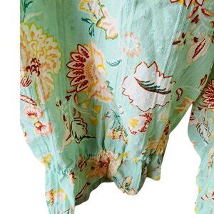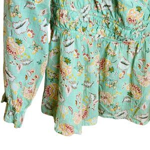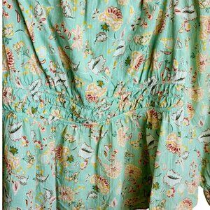 Summer light green floral blouse with a square neck, raglan long-sleeves with elastic cuffs and waist detail. Fabric has a textured dots and stripes. Torrid pre-loved plus-size boho style blouse with a floral print. Great for the weekend or a dinner or BBQ.