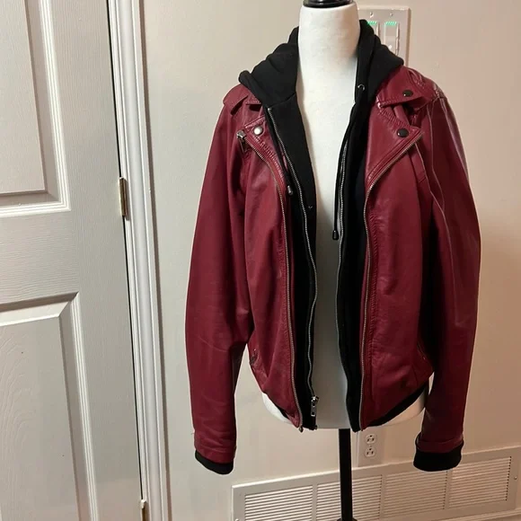 Stylish red leather jacket. Features zip closure and black lining. Perfect for a chic look.