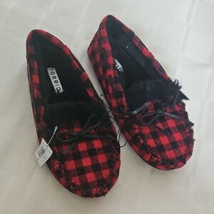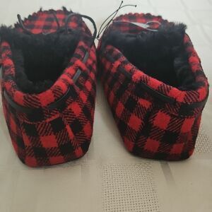 Stylish red and black checkered moccasins. Soft faux fur lining. Ideal for comfort.