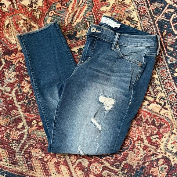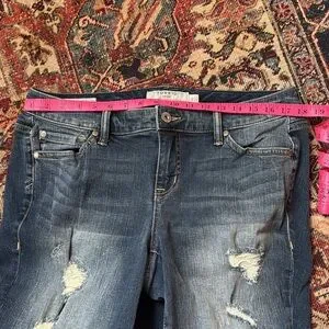 Incredible high quality Torrid jegging denim. Beautiful distressed style. These don’t look as exceptional in the photos. They are meant to be modelled on, as they really fit to the body and the distressing takes shape that way. These did fit me well but I have since lost weight and they do not fit sadly. They are a good everyday pair. The wash is beautiful and the quality is fab. Like brand new. No blow outs in the distressing. Like most jeans they don’t measure to their tagged size, so please see photos, measurements and insights.