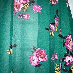 This stunning Torrid duster is the perfect lightweight layering piece for any season! Featuring a rich green color with vibrant dark pink floral accents, it’s flowy and open with flattering 3/4 length sleeves. Ideal for throwing over a simple outfit to add a pop of color and style. The size 1/2 fits comfortably, and it’s in excellent pre-owned condition.