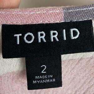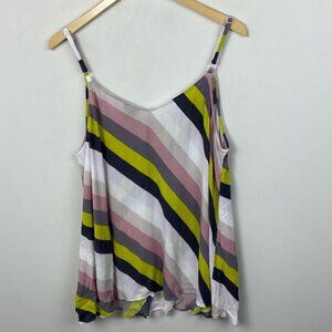 Torrid Sophie Multi Stripe Crinkle Gauze Swing Cami Tank in Women’s Size 2X. Yellow, white, pink and grey diagonal stripes. Adjustable straps. V-neck. 100% rayon. Good pre-loved condition. No visible flaws. See photos for details.