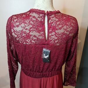 At The Knee Studio Knit Lace Sleeve Fit N Flare Dress. rhubarb Burgandy red with pink undertones New with tags. Plus size 1x.