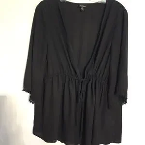 Preloved cleavage-baring plunging neckline has an adjustable tie so you can loosen or tighten the fit of this sheer babydoll blouse.