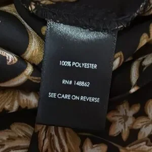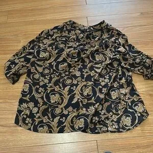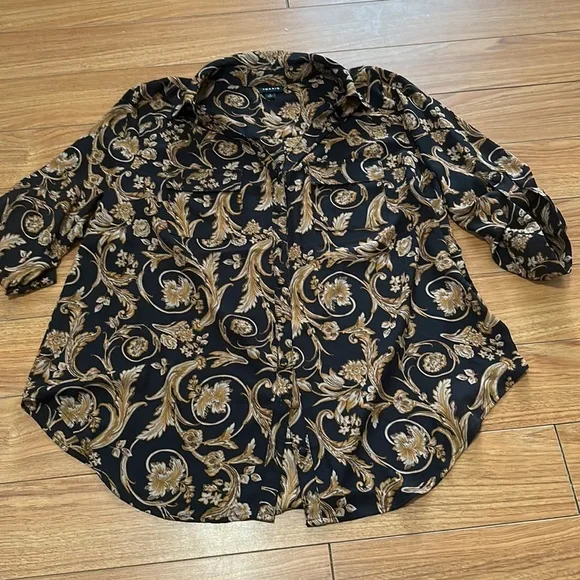 Torrid size 0 (equivalent to large). Black with really pretty filigree pattern. 100% polyester. Light and airy.