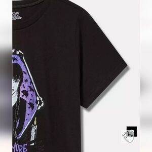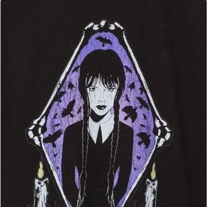 Black crew tee featuring a Wednesday Nevermore graphic. Perfect for casual wear.