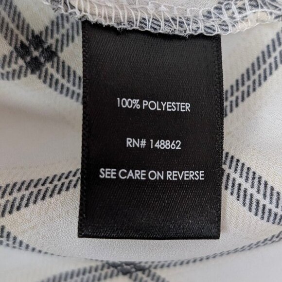 This sleeveless blouse by Torrid is made of 100% polyester and is white/slightly off-white with a simple plaid-like pattern made of short dark blue lines (most visible in the label pics). The shirt buttons down the front and has a tunic-like (lack of) collar. There is nice darting throughout that gives the top a little structure, but the most interesting part of this top is the front tie (pics 4 and 5). Undone, I admit I was a little skeptical because it looks a little silly and flat. However, once you tie the front, the extra bits of fabric are pulled towards the center and the tie and pattern work well together to help "disguise" areas that people are often self-conscious of, without going overboard and making it obvious. It surprised me, I quite like it. The top has normal wear, but no issues affecting wearability.