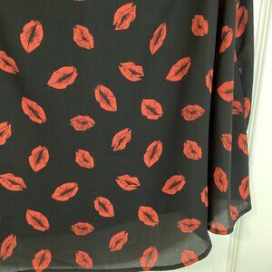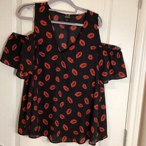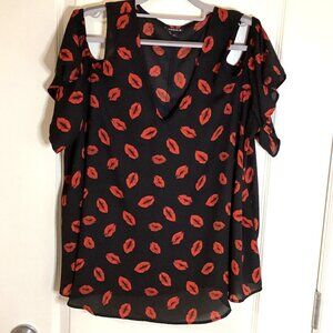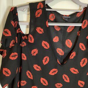 Torrid Women's Black Semi Sheer Cold Shoulder Top Blouse Red Kiss Lips Sexy Size 0 Fairy Feminine