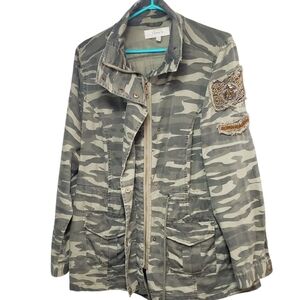 100% Cotton green camo military style jacket coat. Zip up and snap close Drawstring waist. Pockets!