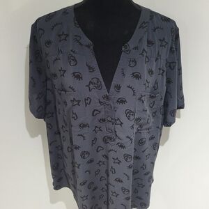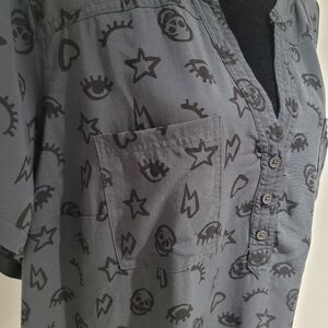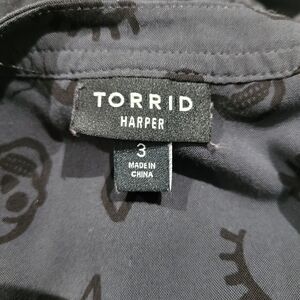 Torrid Harper georgette blouse in size 3 featuring an edgy skull print on a charcoal gray background. Lightweight and flowy with a relaxed silhouette — perfect for whimsigoth, casual, or alternative styling. Easy to pair with jeans, skirts, or layered under jackets for everyday wear with attitude.