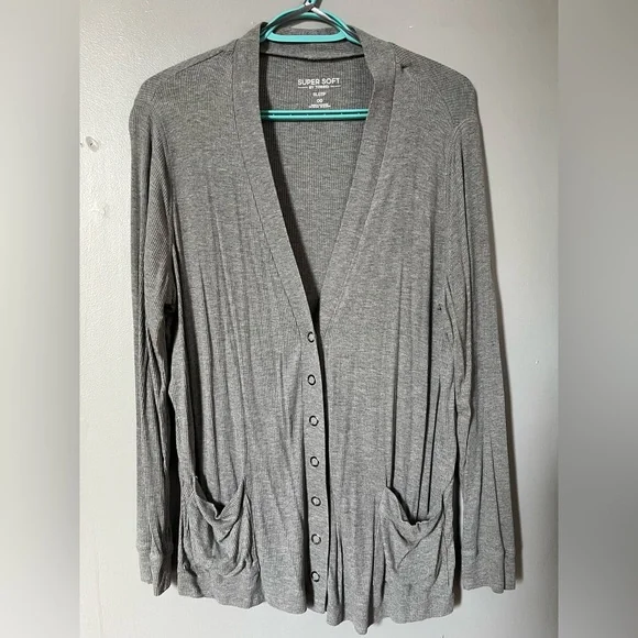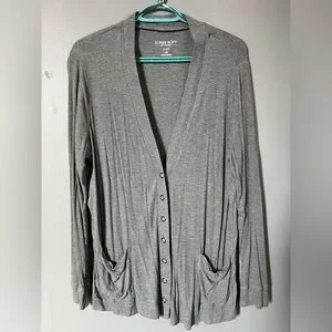 Cozy gray button-up cardigan with front pockets. Torrid size 00 fits like a women’s 10 or medium/large. Excellent condition.