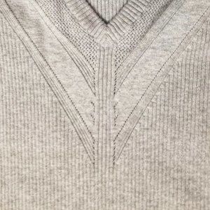 Gorgeous light grey ribbed sweater from Torrid. Features a V-neck, ruffle details on each shoulder, and a geometric knit pattern on the front. Bodycon fit. Excellent pre-owned condition, no flaws. Fits a women's size 2X US (18-20). Material composition is noted in last photo.