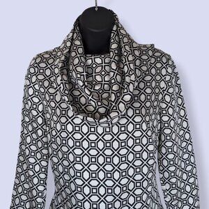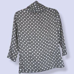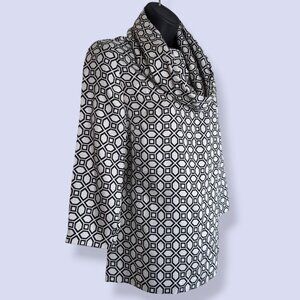 This blouse by Tory Burch is made of 100% silk with a black and white geometric pattern and a long cowl neck (see pic 6). The top has 3/4 length sleeves, darting in the back, and a hidden zipper on the left side for dressing. There is normal wear, but no issues affecting wearability.
