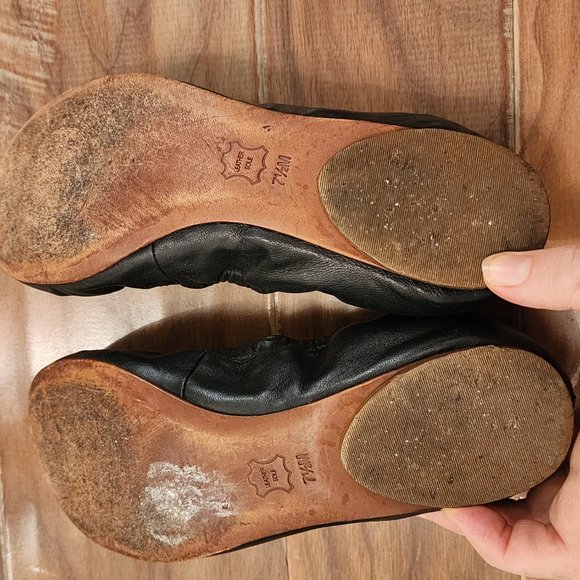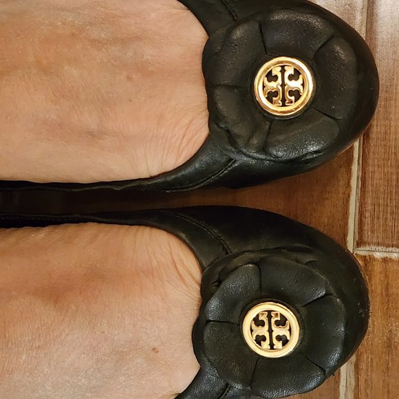 These are a used pair of black Tory Burch Ballet Flat in size 7.5. They have been worn only a few times and no longer fit me after pregnancy (my feet grew!). I've had them for ages sitting in the box. There are some minor scuffs on the front of the toe (see pic) that I'm sure can be removed with a bit of polish. Otherwise, they are in great condition.