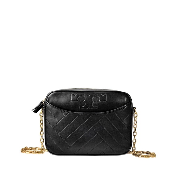 Elegant black crossbody bag. Features gold chain strap. Iconic Tory Burch logo detail.