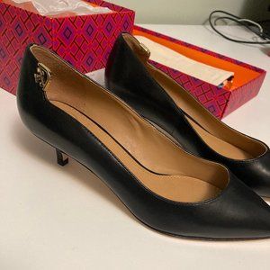 Black leather kitten heels (40mm) with Tory Burch gold logo on the sides. Worn once to try on, but too big (would be better for someone size 5.5).