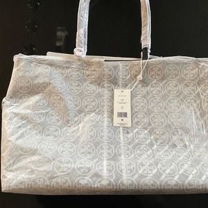 This is a brand new, never used, still in wrapping Tory Burch Black Geometric Logo Striped Tote.