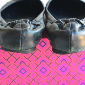 Well-loved Reva flats from Tory Burch with significant wear, but most scuffs are not very noticeable when worn. See photos for condition. This is the black leather version with gold hardware (box is labeled incorrectly). Size 5.5 and fit true to size. Will ship with the original box.