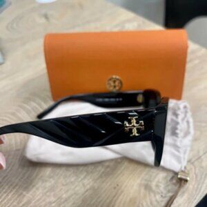 Tory Burch sunglasses paired with orange case. Originally $300+ with tax and added UV protection polarized feature from Sunglass Hut. Worn once, fit great, selling because I was gifted a similar pair :)