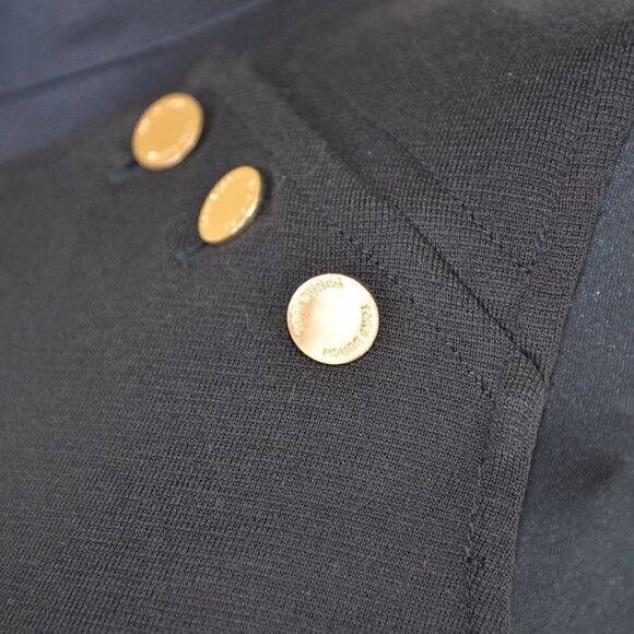 Beautifully tailored black sheath dress by Tory Burch. Crafted from a sturdy wool blend fabric, this dress features branded gold button accents at the collar, sleeveless cut, and a zip closure at the side.