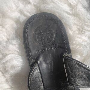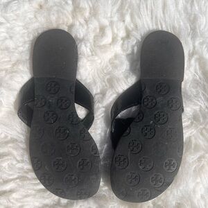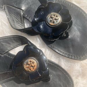 Tory Burch Breely Black Patent Gold Logo Flower Flip-Flops Sandals US 7
