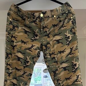 Awesome Tory Burch camouflage print super skinny jeans with regular waist, concealed front zip and button closure, dual front slip pockets, dual back slip pockets. Gold tone hardware. Size 30.