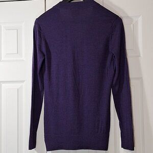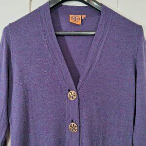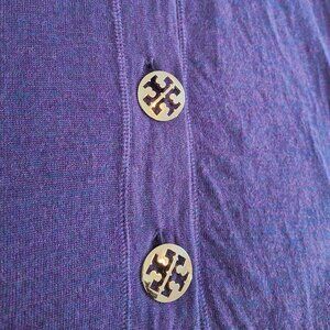 Medium purple 100% merino wool cardigan, adorned with beautiful original Tory Burch gold buttons. A classic must-have for cool days and evenings, worn indoors in the air, over a casual T-shirt and jeans, or over a pretty dress.