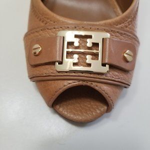Tory Burch Carnell Royal Tan Leather Peep Toe Cork Wedge