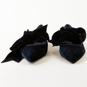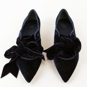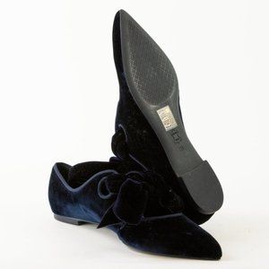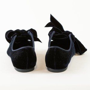 Inspired by a turn-of-the-century French shoe, the sculptural Clara ballerina flats from Tory Burch are made in a Blue Notte navy velvet, and feature a low heel, a pointed toe, an exaggerated bow on the vamp, a curvy topline with grosgrain trim, a quilted satin insole with a tonal logo, and leather lining and soles.