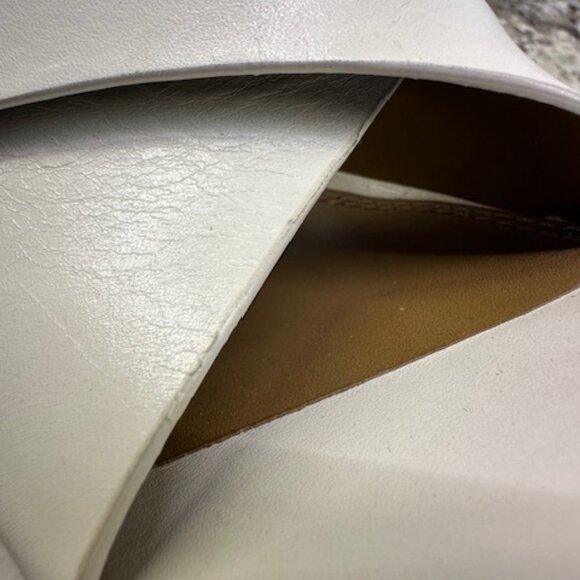 Light ivory leather adds elegance to any wardrobe with a flash of mod color/wood in the wedge.