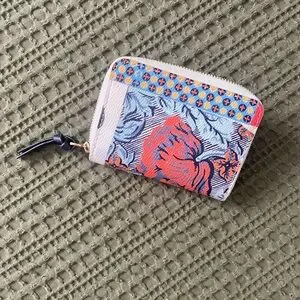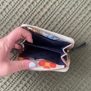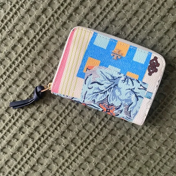 Vibrant Tory Burch wallet with a bold pattern. Features a secure zip and stylish design.