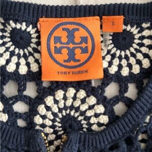 Tory Burch Crochet Cardigan Sweater Navy White Striped Zip Front Small