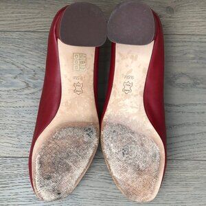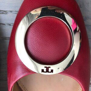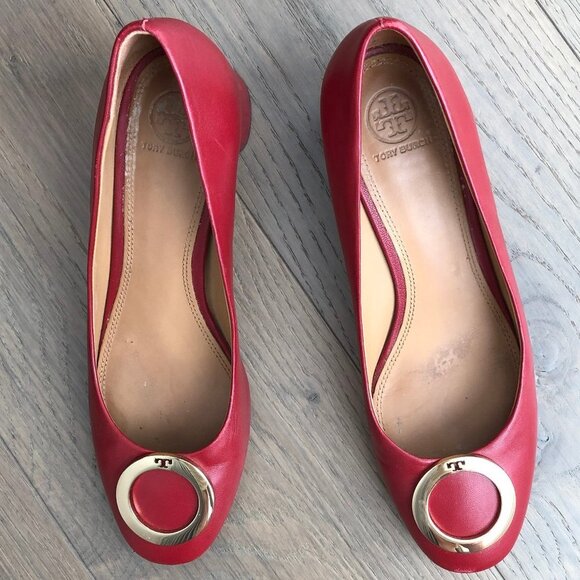 Tory Burch Designer Leather 1.75" Heeled Pumps with Gold Metal Circle on Almond Shaped Toe in Red